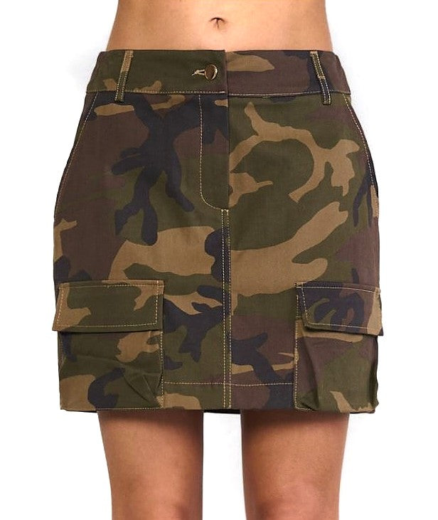 Mini skirt by KAOS JEANS in military pattern with front pockets with flap. Made in Italy. Code: PIJLE011 Color: MILITARY