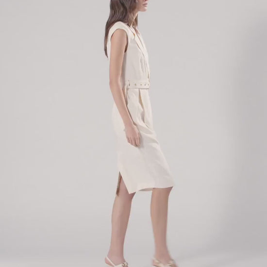 L'abito Amadine reinterpreta il tubino con una sofisticata costruzione a portafoglio, valorizzata dallo scollo a V con revers che richiama il gusto sartoriale. La cintura coordinata con fibbia dorata enfatizza la silhouette, rendendolo perfetto per un'occasione speciale o una cerimonia. Per un evento serale, la linea aderente e i dettagli raffinati si sposano idealmente con una décolleté o un sandalo dal design pulito.