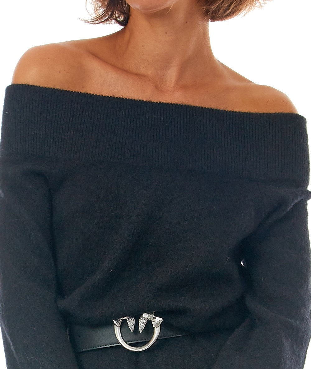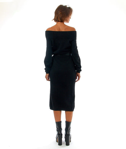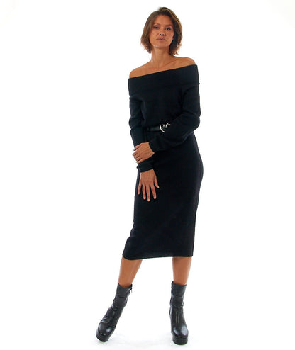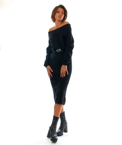 Angora midi dress by SEMICOUTURE , featuring off-the-shoulder and long sleeves. Code: Y2WD08 Color: BLACK