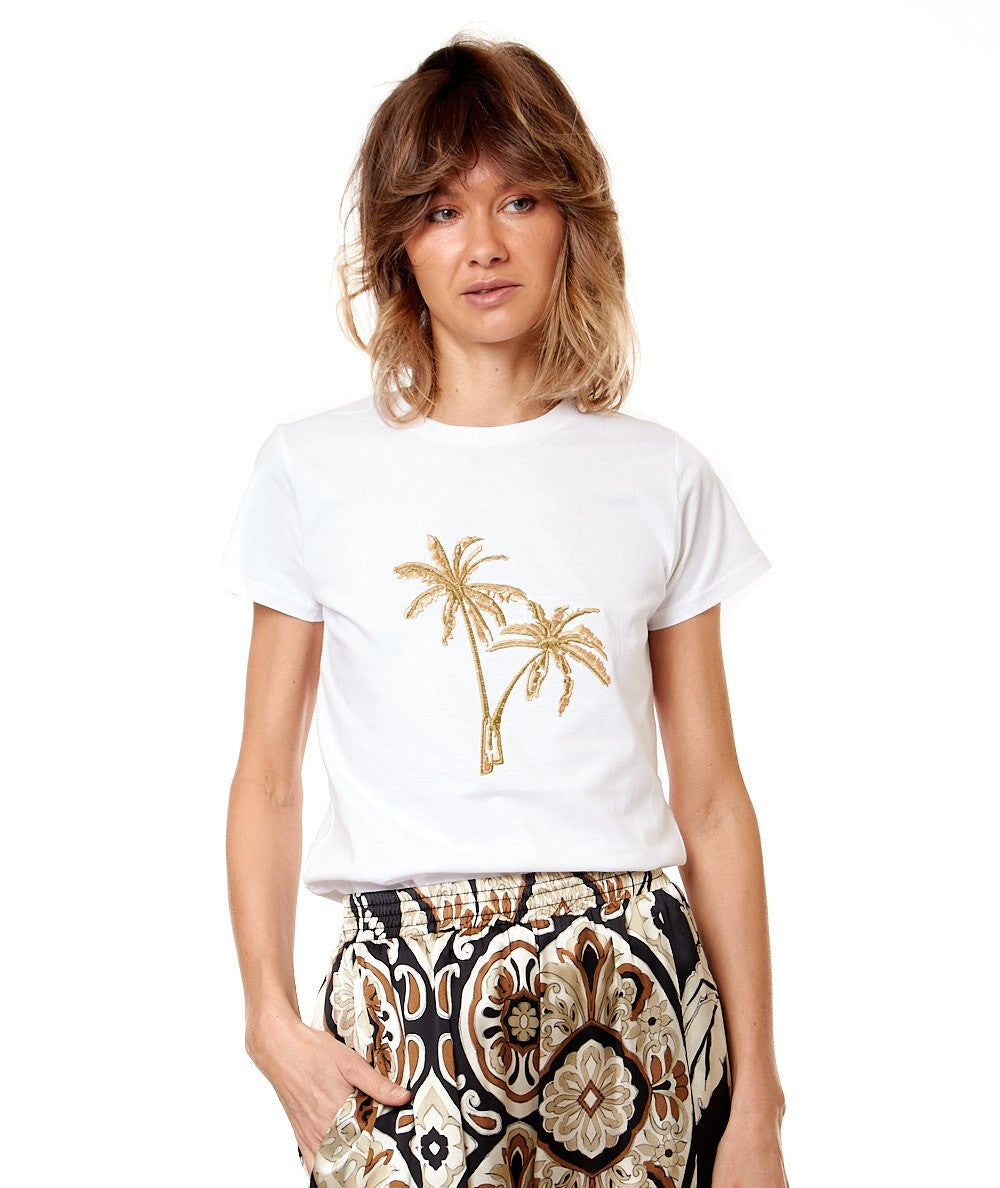 Cotton T-shirt by SHIRTAPORTER embellished with golden palm embroidery and removable shell-shaped brooch. Made in Italy. Code: TS3278 Color: WHITE