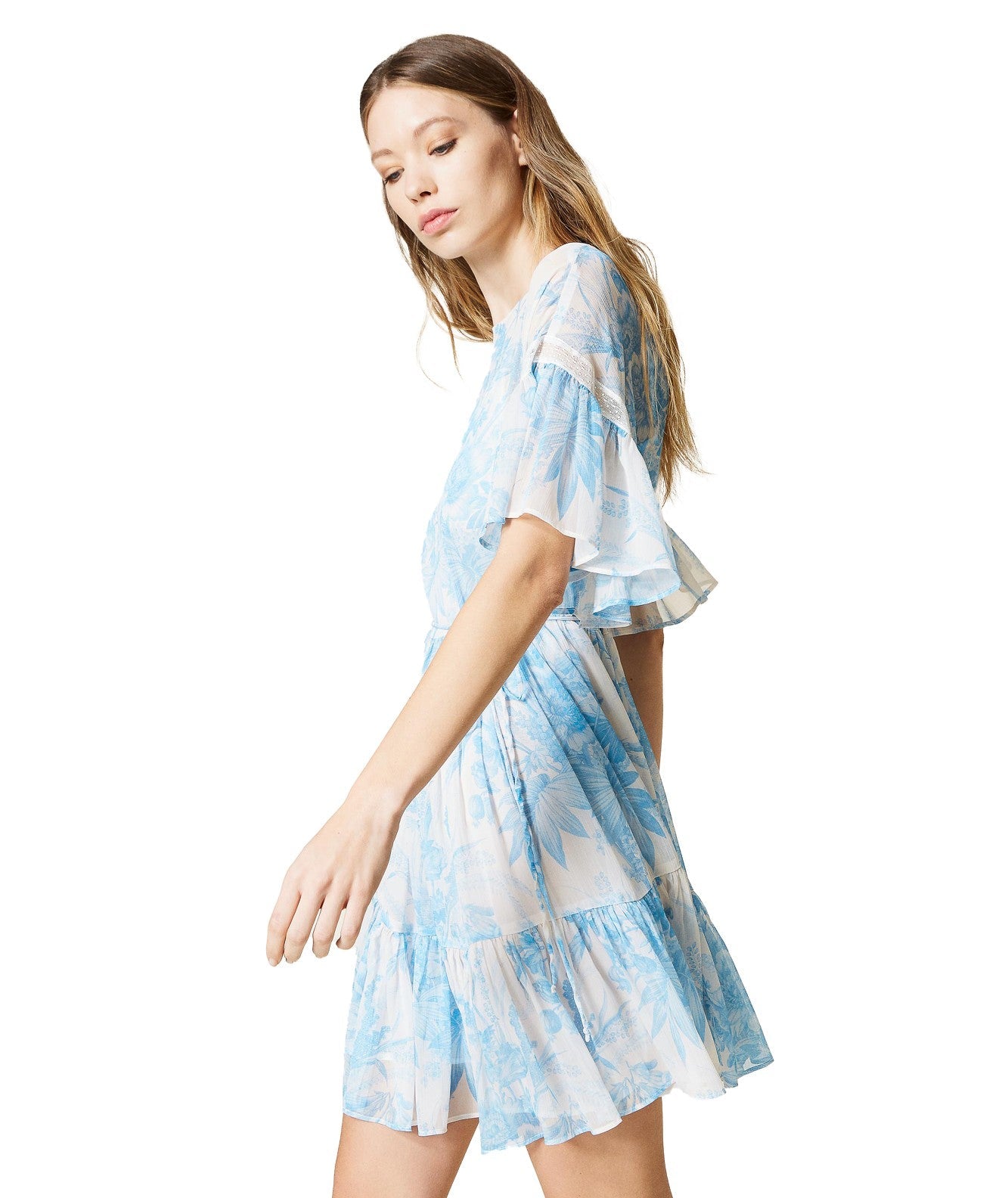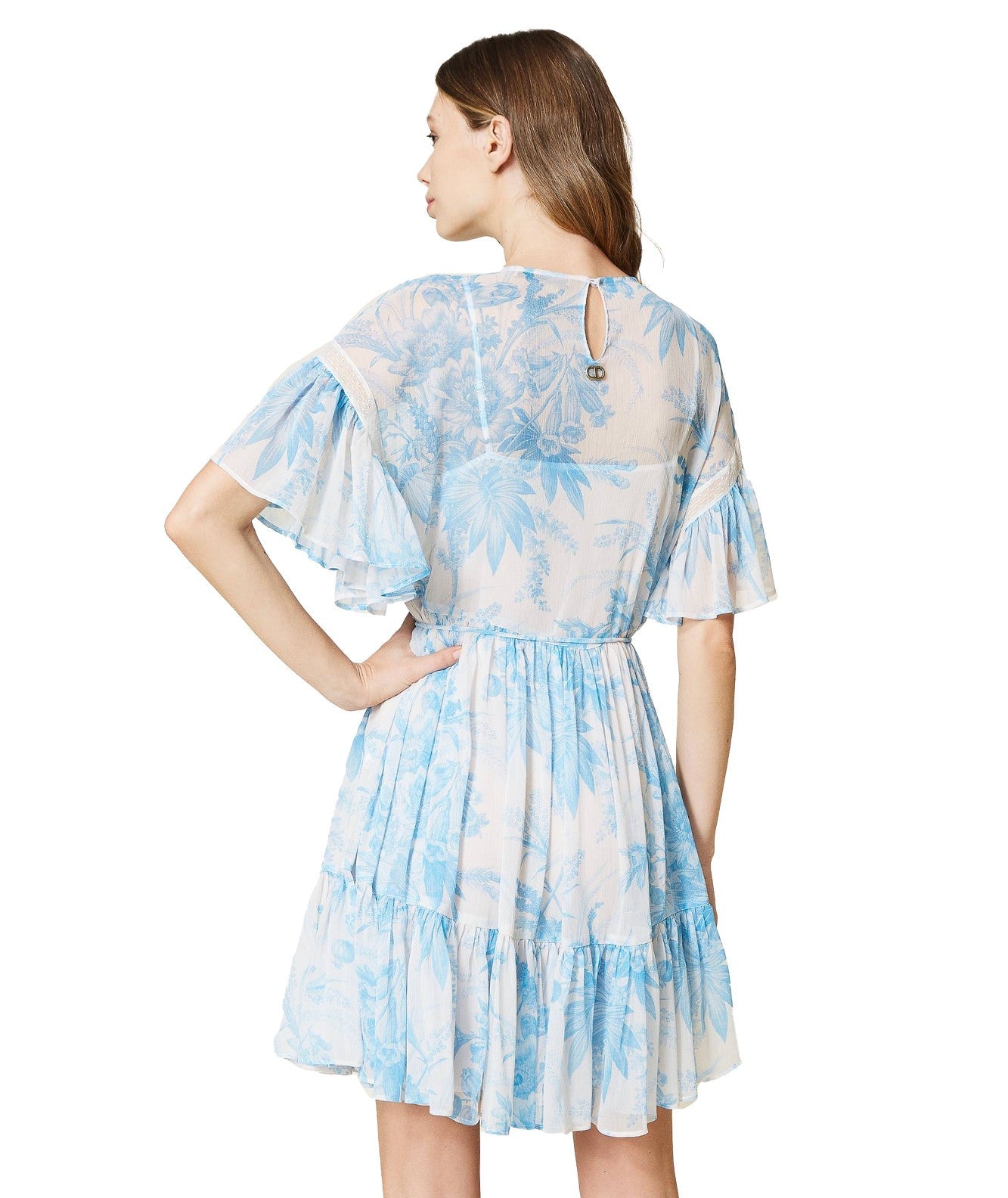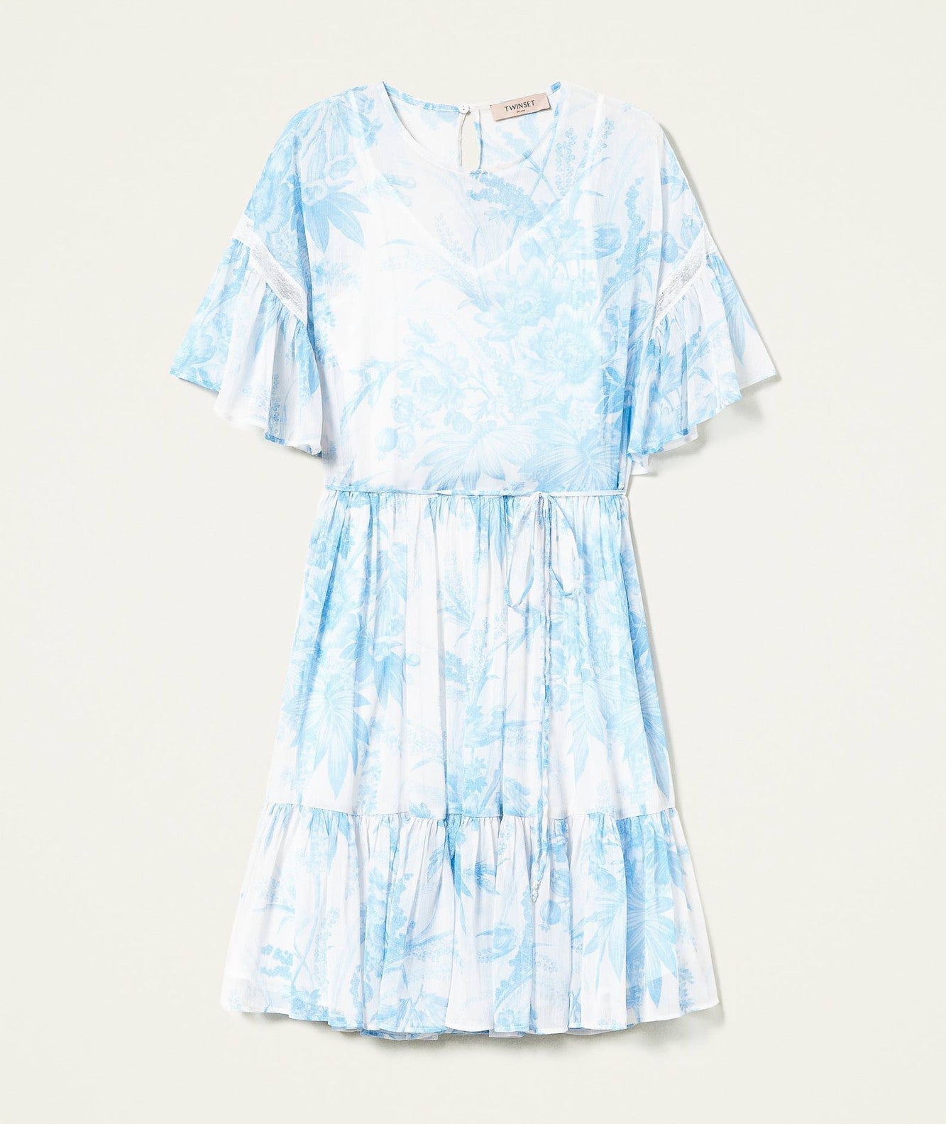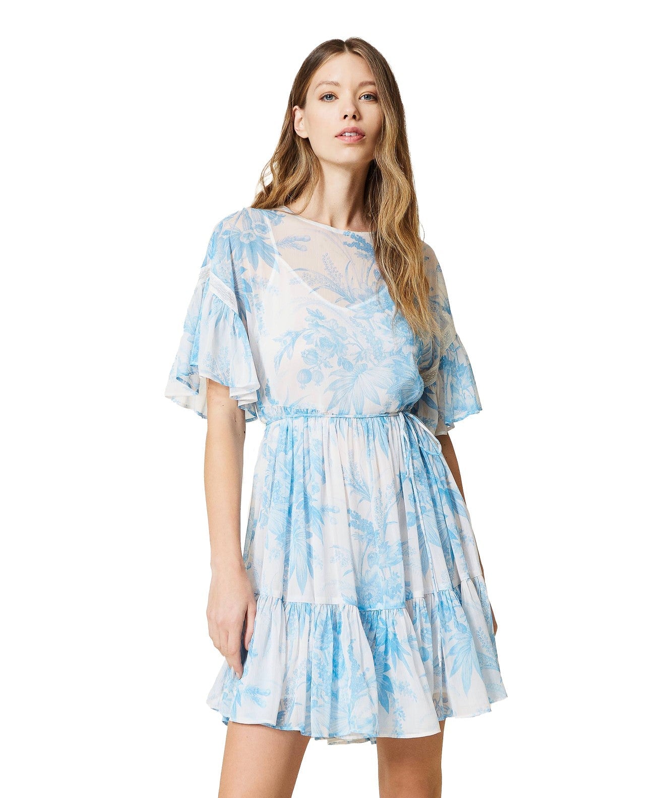 Short dress in light creponne by Twinset with toile de Jouy floral print, featuring ruffled sleeves and flounce at the bottom. Made in Italy. Code: 221TP2712 Color: LIGHT BLUE