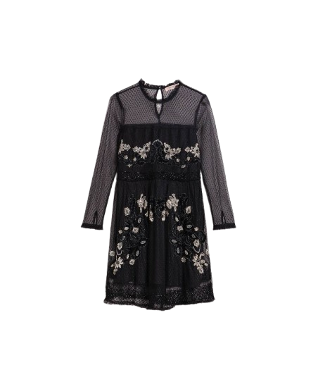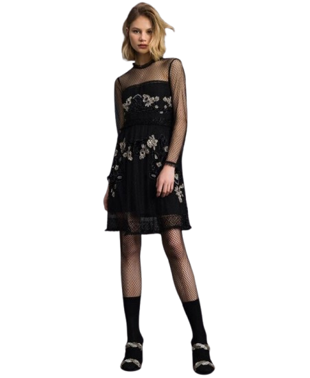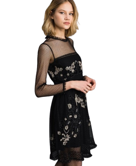 Short dress by Twinset in plumetis toulle with floral jewel embroidery with velvet, model 192TT2041 Color: BLACK