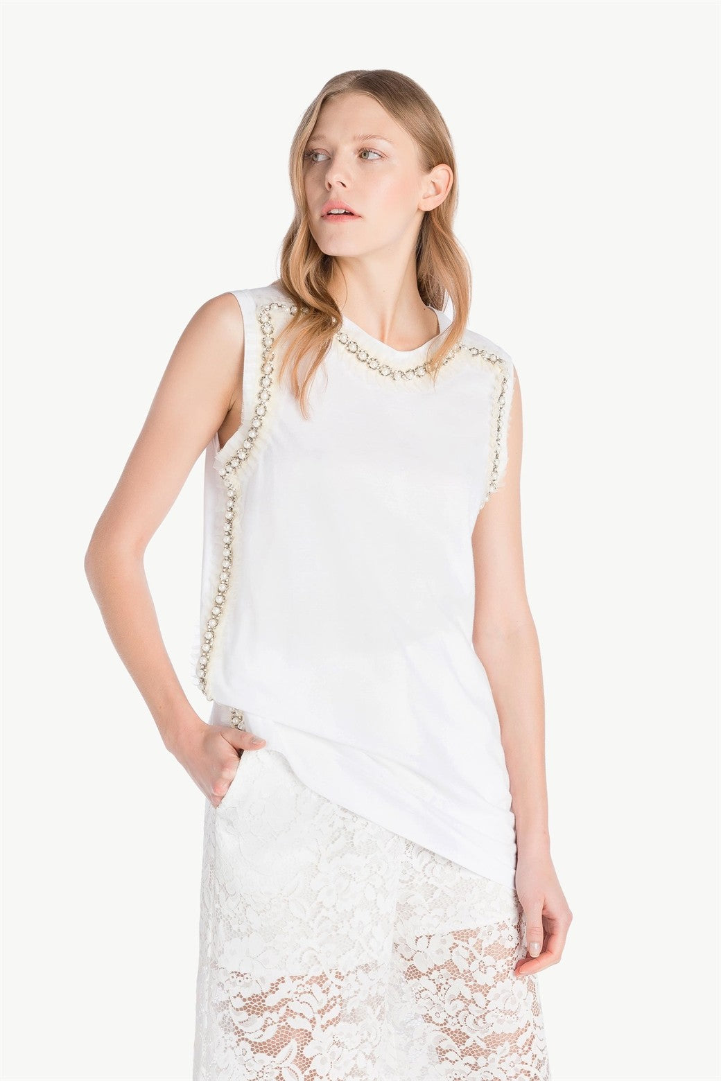 Long tank top by Twinset by Simona Barbieri with tulle, pearl and bead profiles.